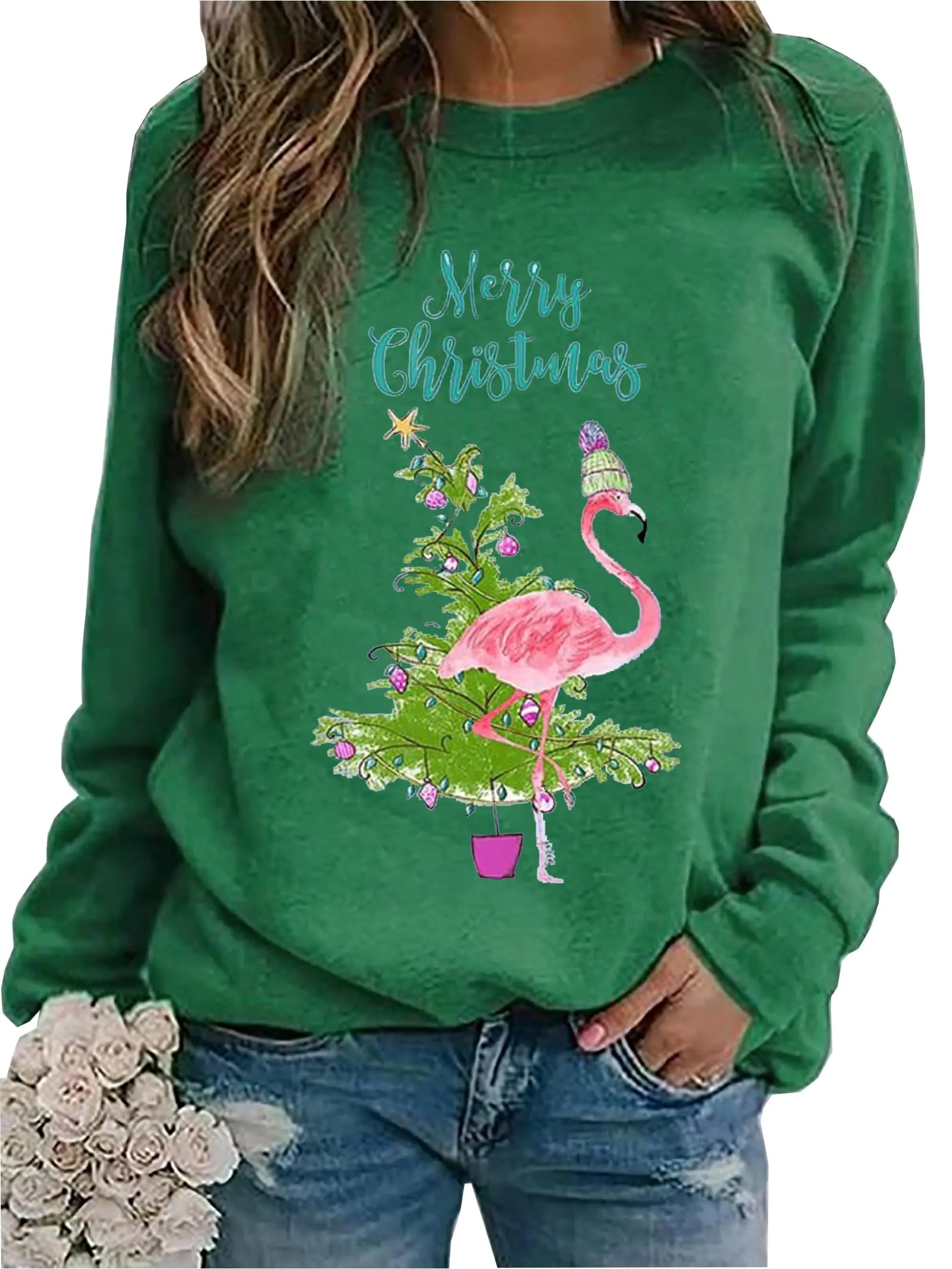 Flamingo Christmas Tree Women's Sweatshirt - Green, Large