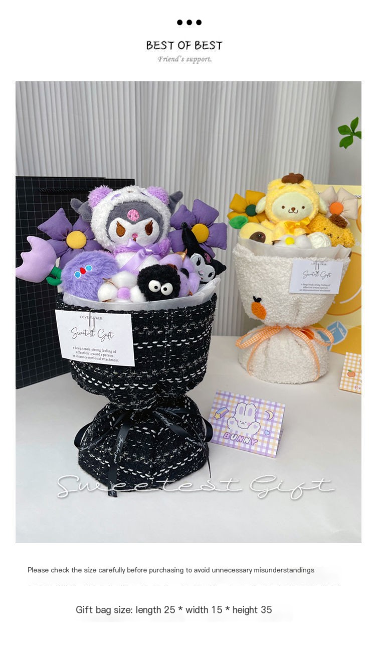 Crafted from soft fragrant fabric, this plush bouquet is as huggable as it is beautiful. Each variation comes uniquely designed, ensuring there's a perfect choice for everyone. From the elegant Purple-Premium Kulomi to the adorable Yugui Dog bouquet, you can choose a style that resonates with the personality of the recipient.